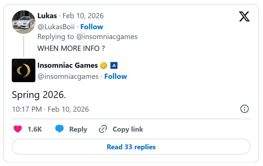 “Spring 2026” can mean late March onward, and studios often reserve major showings for a dedicated beat: a standalone trailer drop, a PlayStation Blog feature, or even a game‑specific State of Play segment. If Insomniac sticks to that window, expect the next meaningful update to land after the February showcase cycle.